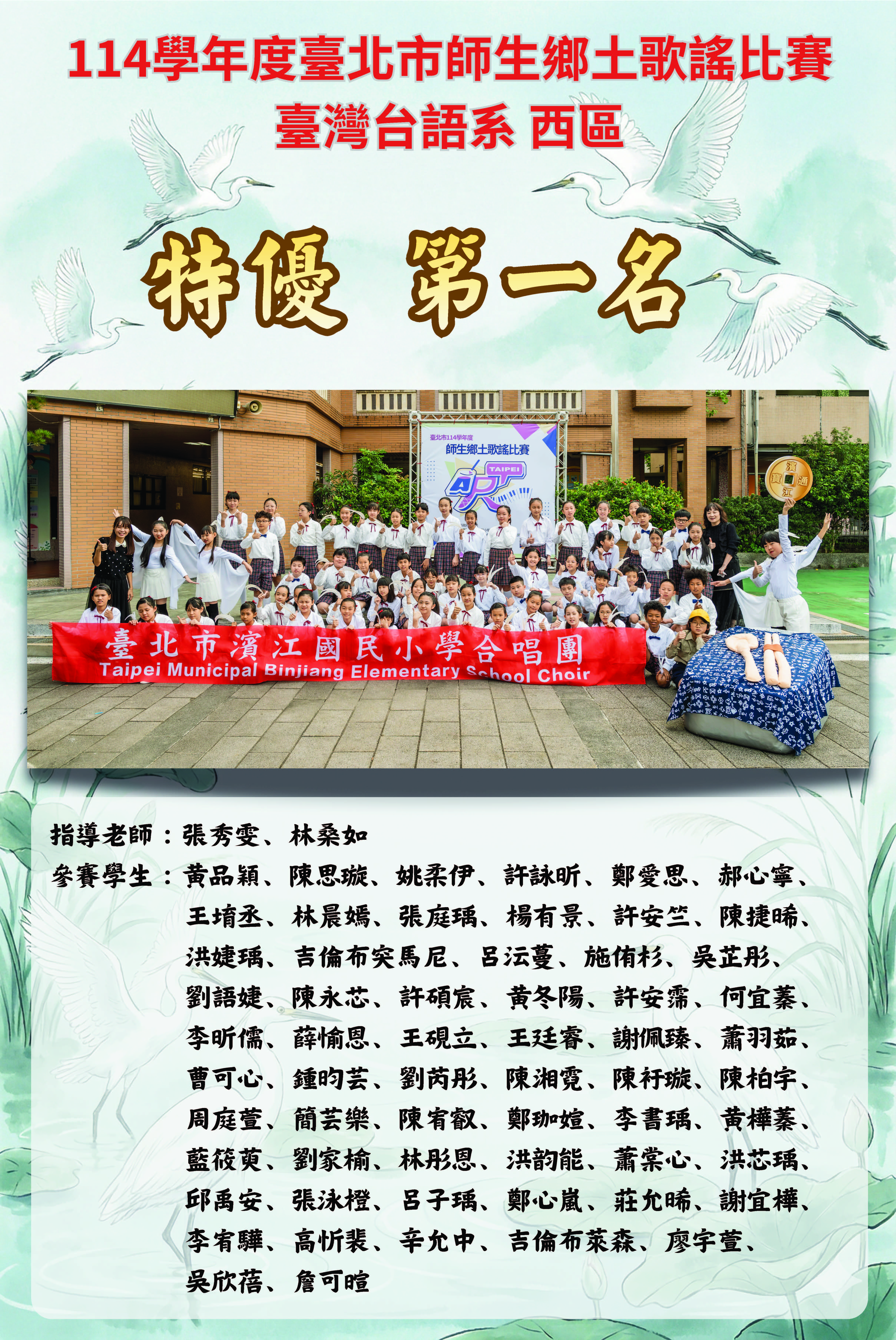 標題:賀!本校合唱團參與114學年度臺北市師生鄉土歌謠比賽榮獲臺灣台語系-西區 特優 第一名