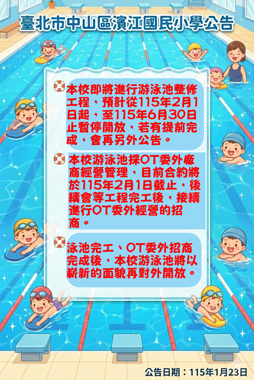 標題:本校游泳池重要公告,敬請點選附件圖片詳閱!