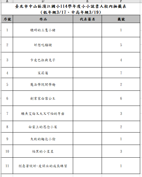 臺北市中山區濱江國小114學年度小小說書人校內抽籤表請詳見附件
